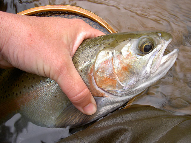 This was not a stocked fish. The rainbows here have not been stocked since the late 1800's. While you cannot call these trout true natives, they are 100 percent wild fish. To hook and land a specimen like this is a rare treat. I was once again reminded of the power of a wild trout - as this fella (lady?) cleared the water and ran so hard a couple times that I had to clear a backlash on my reel. When I finally slipped her in the net, my hands were shaking. When is the last time a stocked brown trout jumped and almost spooled ya?