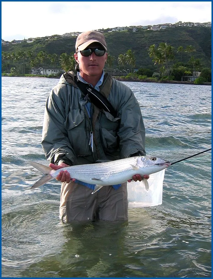 Guide Kevin with a typical (huge) Hawaiian bonefish...for him at least!