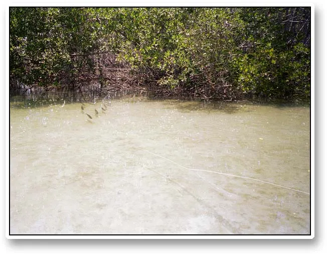 Baby tarpon moving in the mangrove under the trees in a very small space. Yes, that white stripe and the shadow is a line and a rod!