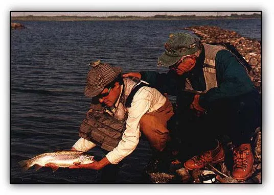 Marco Verschoor and father Bas Verschoor admiring yet another big steelhead from Dutch Lake Oostvoorne.