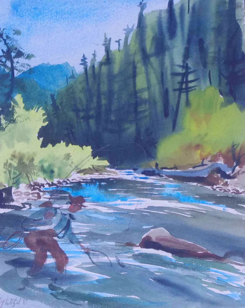 The Bitteroot is a traditional western river full of color and light. The Bitteroot was a favorite of such famous fly tyers as George Grant and also served as background material for the "River Runs Through It". This painting is a typical documentary type impression he made as he travelled and fished across the USA.