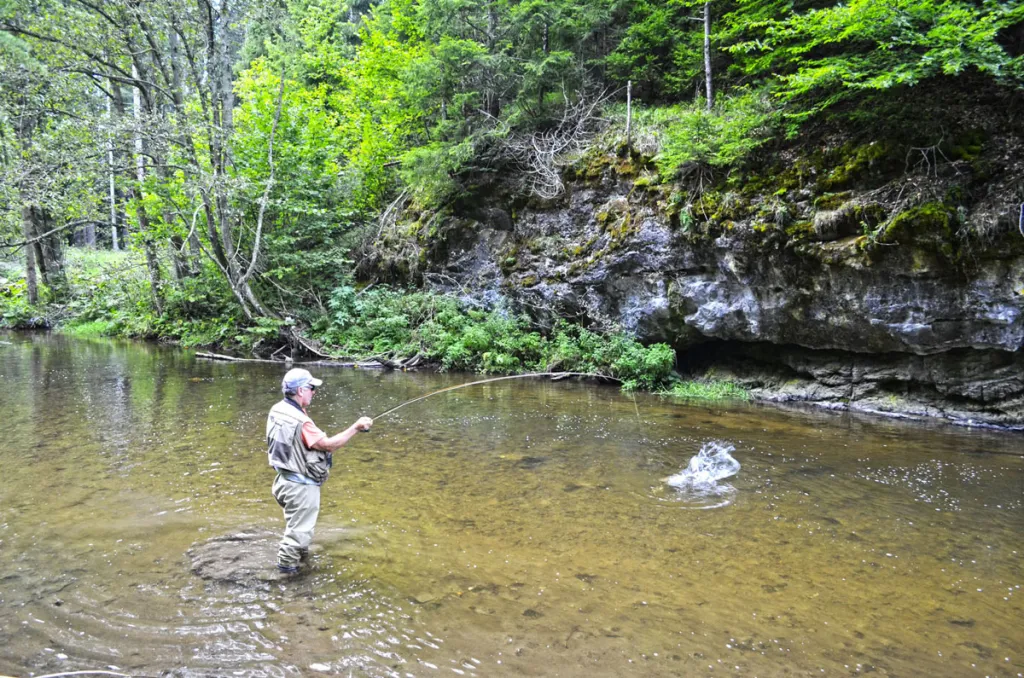 A fight with big rainbow trout in a small high mountain river in Slovakia