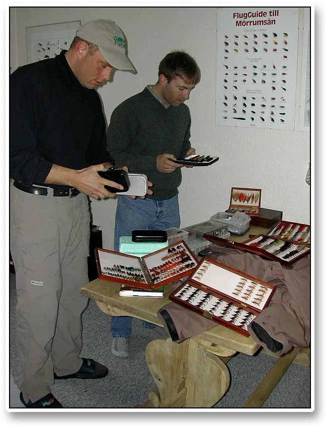Ken shows Sean his immense collection of flies. Ken ties flies almost every day and has enough flies for a lifetime of fishing for salmon and sea trout.
