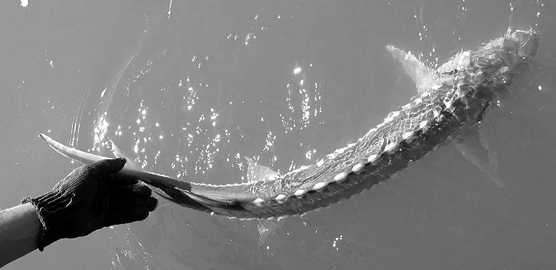 A small sturgeaon returns to the depths of the Fraser River near Vancouver British Columbia, Canada.