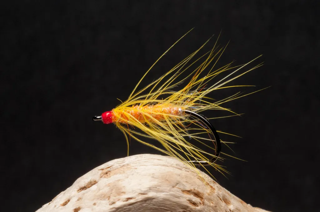 A fly for Danish coastal sea trout in a color used fairly rarely for these fish: yellow. Tied by German Kai Nolting and given to me during our autumn trip 2019.